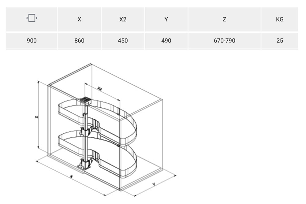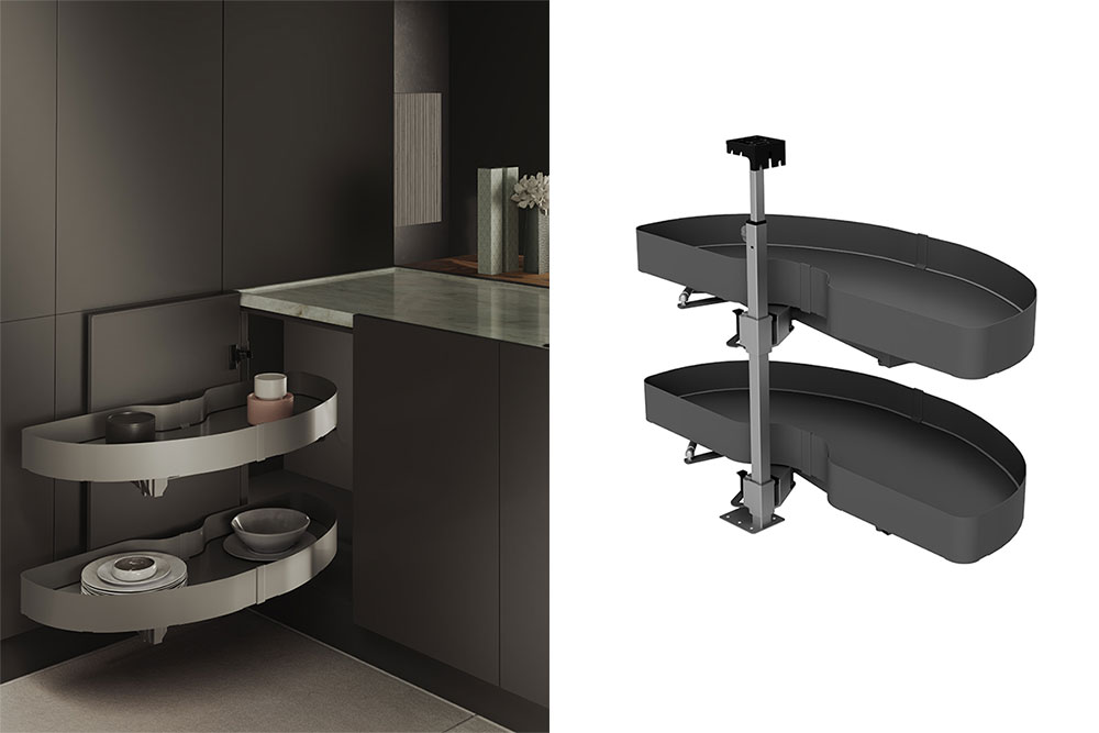 Two painted sheet metal shelves, reversible and adjustable, make up the new mechanism for the base kitchen corner and refine its usability.